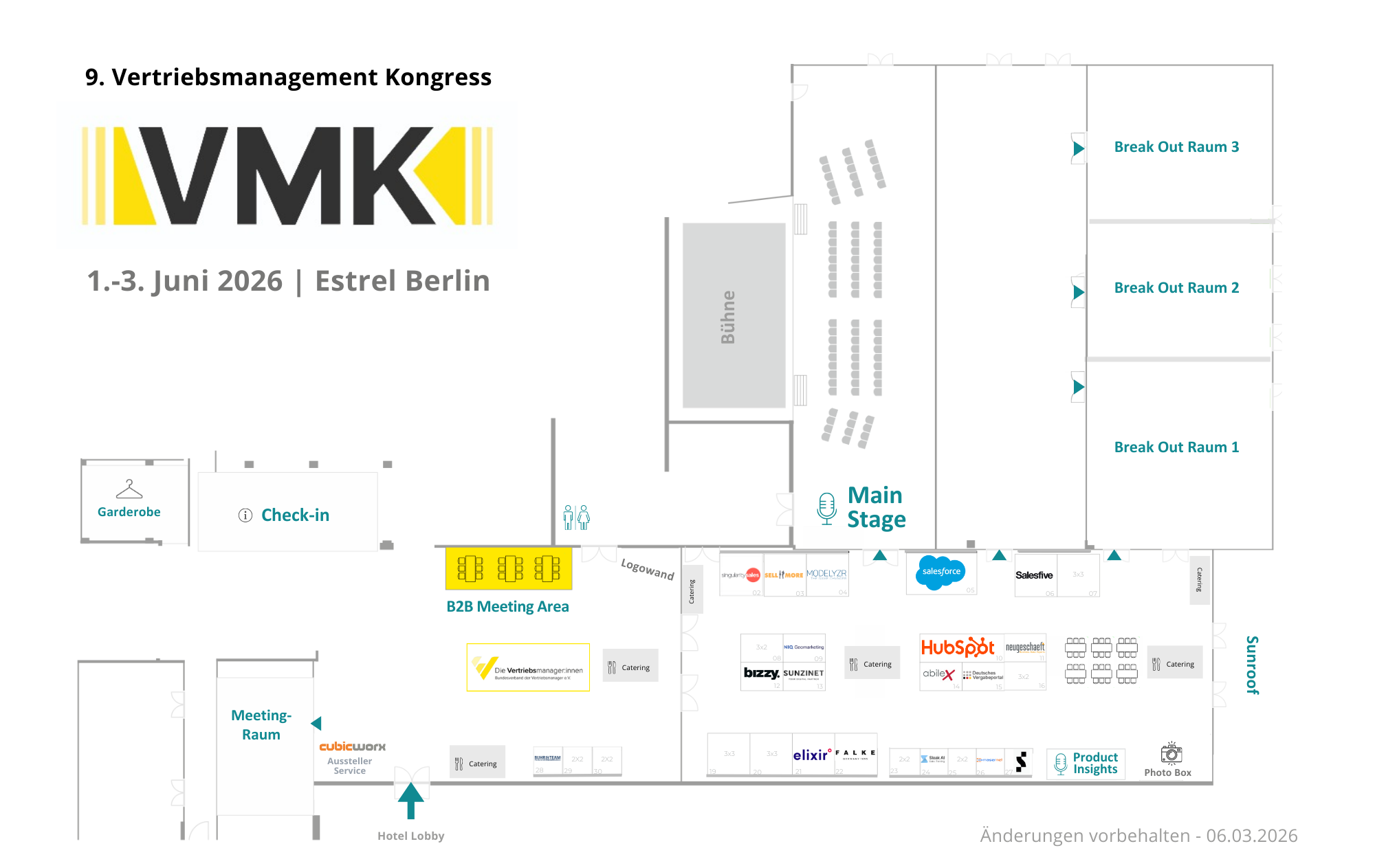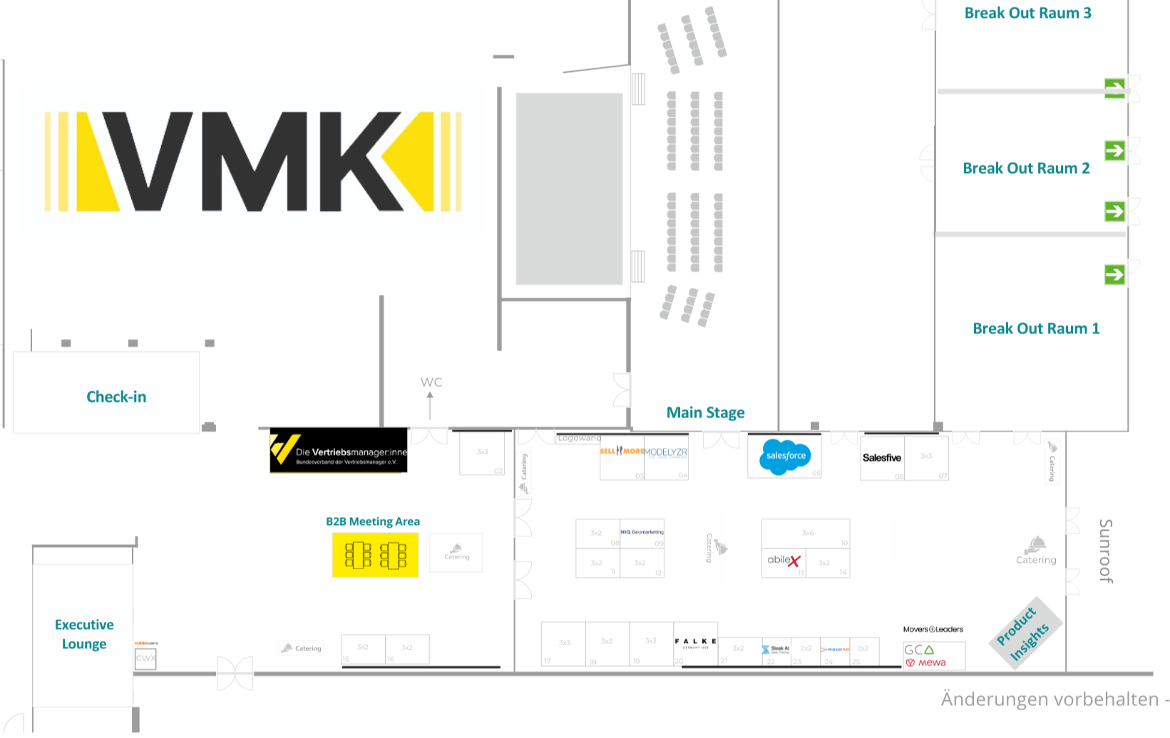 Das lichtdurchflutete Foyer ist mit den Cateringinseln, der B2B Meeting Area, einer Working Zone und der Lounge des Bundesverbands der Vertriebsmanager:innen auch zugleich das pulsierende Herz und die Seele des Events. Hier treffen sich die Teilnehmende, Speaker und Aussteller zum Mittagessen und in den Kaffeepausen, knüpfen neue Kontakte und diskutieren über Herausforderungen im Vertriebsmanagement.
